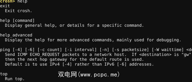 如果我们没有涵盖您所需的命令,请键入 help 或 help_advanced 以查看所有Crosh命令的完整列表可供您使用。