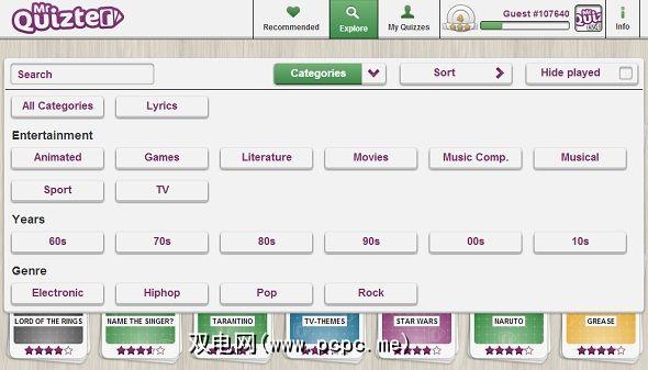 寻找新的测验是绝对的轻率。有一个本周测验,您还可以按“趋势",“最新"和“最高评分"对所有可用的音乐测验进行排序。使用“浏览"标签,您可以按关键字搜索,或查看不同类别,包括流派,年代和电影,视频游戏和体育等主题。