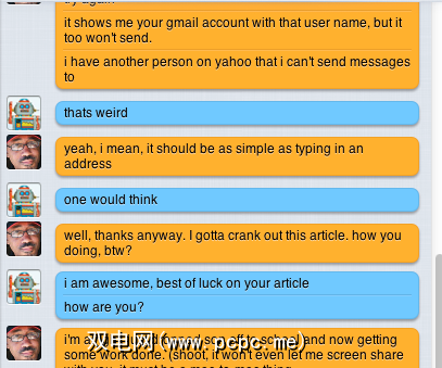 Apple说Messages支持其他IM客户端,包括AIM ,Google,Talk,Jabber和Yahoo Messenger。但是在我执行的一些测试案例中,没有以IM形式发送给YahooIM和GoogleTalk用户的邮件被传递。我也没有收到来自这些收件人的消息。