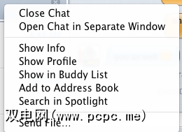 在“消息"左侧面板中右键或按住Control键单击用户名时,并选择“个人资料"部分下的“显示信息",您将看到一个列表,列出了该选定用户的聊天功能,例如聊天,内联图像,聊天室,脱机消息传递,发送文件。