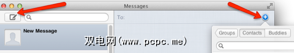 与iChat一样,您可以通过单击消息左侧的消息图标来启动消息(或请使用键盘快捷键Command + N),然后在“收件人"字段中键入收件人的地址或电话号码。您还可以单击蓝色+按钮,然后从通讯簿中访问名称,然后从iChat中启动“好友"列表。