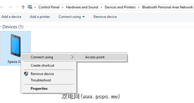 同时在计算机上,展开系统托盘以找到蓝牙图标,然后右键单击它。选择加入个人局域网络,找到手机的图标,然后右键单击它。在出现的菜单中,选择使用>接入点进行连接。