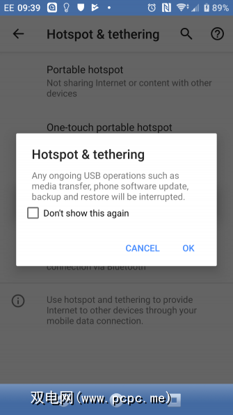 下一步,在Android设备上,打开设置>网络和互联网>热点和网络共享。点击 USB网络共享选项。 热点和网络共享警告将会出现,通知您继续操作会中断手机和PC之间的任何现有数据传输。