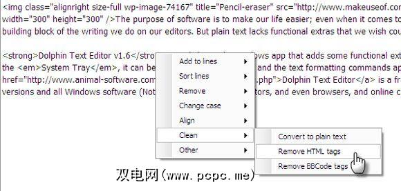 Word确实可以如果您正在处理任何格式的文本,则将帮助您。但是想想转发的电子邮件或在讨论板上对您的评论的答复:如果您想修饰它们,则Dolphin Text Editor可以通过将所有内容转换为纯文本,删除HTML标记并剥离所有BBCode标记来帮助您清除文本。