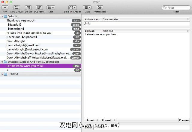 OS X不会让您做任何过于复杂的事情,但是您可以添加您最常键入的内容有一些不同的顺序,请尝试一下。如果您喜欢它,并且您认为自己将从文本扩展应用程序中受益-我几乎可以保证会-您可以考虑投资更全面的选项之一,例如aText($ 4.99),TypeIt4Me($ 20)或TextExpander($ 35),如下图所示。