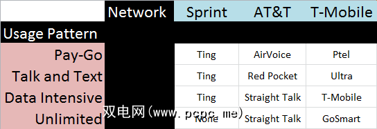 在美国,有四个主要运营商:Sprint,Verizon,AT&T和T-Mobile。看来Verizon短期内不会获得Nexus 5。因此,基于Verizon网络的MVNO(例如PagePlus Cellular)目前不为Nexus 5提供服务。对于所有其他用户,您的理想计划取决于使用和覆盖范围之间的连续性。我已经为每个蜂窝网络确定了五种使用模式及其相应的最佳MVNO: