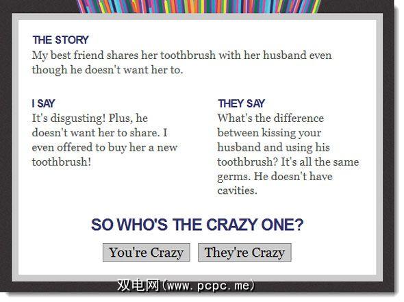 喜欢在世界上最接近的地方进行一次民意调查,以在您这一方面达成共识你不合作吗?该站点使您可以输入您的故事并将其尖叫到网络上。让互联网为您决定。通过推文,RSS或电子邮件获得链接的读者可以投票支持该论点。我希望所有世界上的冲突都可以通过这种方式解决。