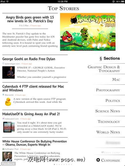 在iPad或iPhone和杂志风格的应用程序上浏览和收藏文章例如Zite(以下屏幕截图),Flipboard,Pulse或Reader,使用户可以订阅主题故事和网站内容。