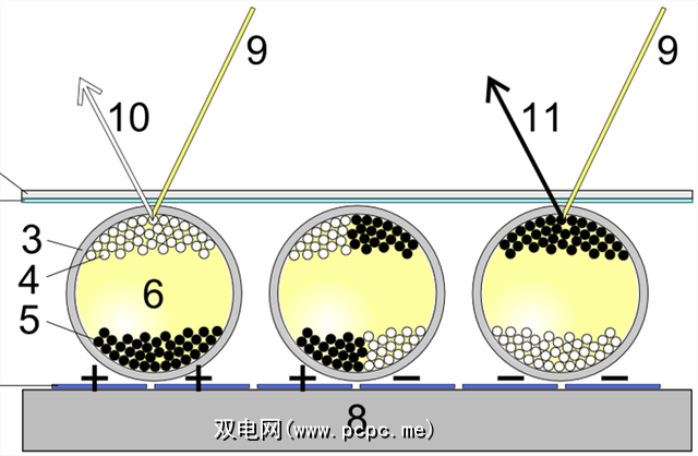 E Ink屏幕的基础技术实际上只是电荷流过的一层油。电荷可以将双极油变成白色或黑色,如下所示: