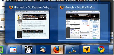 And that’s not all. If you hover over an icon on the dock, little thumbnails show up of every active window of that application. This feature is called “Aero Peek,” and is a perfect way to figure out which application you actually want to change to. The thumbnails are live, which means that if you’re watching a video, the thumbnail shows the video in real-time. Roll over a thumbnail, and you’ll see the window, full-size, with everything else transparent. It’s the best way to switch applications I’ve ever seen, and the fastest way to figure out what you’re looking for – the more applications you run at a time, the more you’ll appreciate the taskbar.