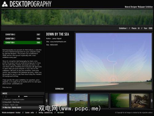 该网站将自己描述为一个展览,由世界各地的设计师创作的自然主题桌面墙纸展示。目前,已经发布了三个展览(年),分别有10、25和40张图像。一个小而独特的收藏。 Deskography使用基于Flash的界面,并且墙纸以zip文件的形式下载,其中包含所有可用的分辨率。现场设计和图片质量给我留下了深刻的印象。