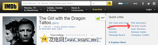 最有效的解决方案是转到 Internet电影数据库,搜索要观看的特定电影,然后在边栏中查找父母指南。每部电影都有相应的页面。