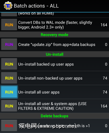 向下滚动到“批量操作"屏幕上的“卸载"部分,然后请点击“卸载所有用户应用程序"左侧的“运行"按钮。