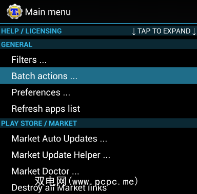 在菜单屏幕上,找到“常规"类别,然后点击其下的“批处理"动作。该屏幕包含您可以一次在多个应用上执行的各种各样的操作-从备份它们以及清除它们的缓存在内的所有操作。