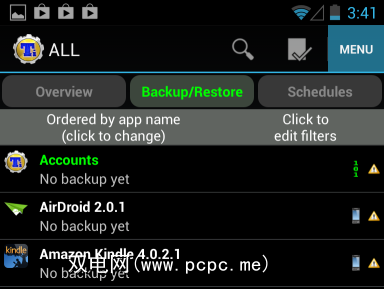 启动Titanium Backup并授予其root特权。拥有后,请点击其界面中的“菜单"按钮。