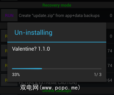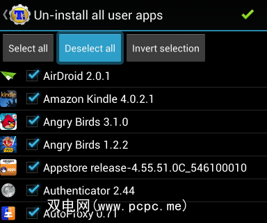 Titanium Backup现在将自动卸载您已选择的所有应用程序。选择,无需任何其他确认。它使用其根访问权限来执行此操作-由于Android的安全模型,应用程序通常无法执行此类操作。