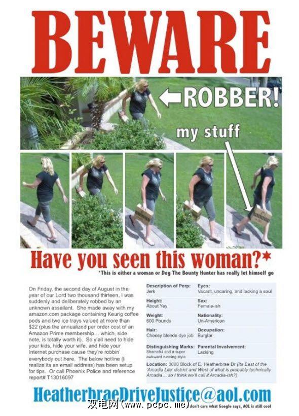 亚利桑那州的一个人并不满足于向警察求助。他的亚马逊包裹中有几个K杯和一个冰块托盘,在光天化日之下从他的前门被盗。他安装了网络摄像头系统,因此他可以完美地捕捉到小偷的镜头,然后用它来制作很棒的“想要的"海报,并将其张贴在附近。他将小偷描述为“ 一个女人,或者是“赏金猎人"的狗真的让自己走了。"