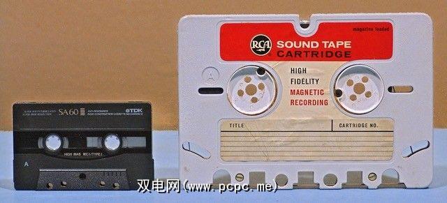 1958年,RCA改变了音乐的未来。引入RCA盒带(如右图所示,紧接在后面的紧凑型盒带的右侧),以减少家庭音乐消费。在使用这种盒式磁带之前,磁带不是家庭使用的现实选择,因为盘式播放器对于消费者来说太复杂了,特别是与唱片播放器相比,唱片播放器已经成为数十年来家庭收听的事实上的标准。