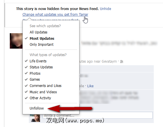 要隐藏应用程序中的更新,请单击右侧的小三角形更新,然后选择是否要隐藏此应用,此特定帖子等的所有活动。您可以对其他人执行相同操作-单击三角形并选择“隐藏",但在这种情况下,您将只是掩盖了故事。要更改您可以从此人看到的更新或完全取消关注,请单击“更改您从