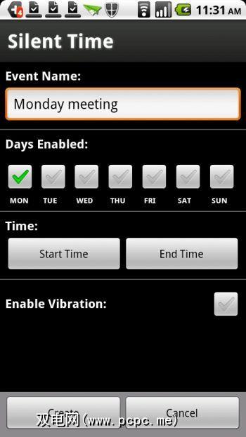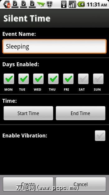 添加新的“事件" 只是一种易于使用的表格,您可以在其中为事件加上标题,检查日期,然后指定时间范围电话应该保持静音。您还可以在此期间允许或禁止手机振动。