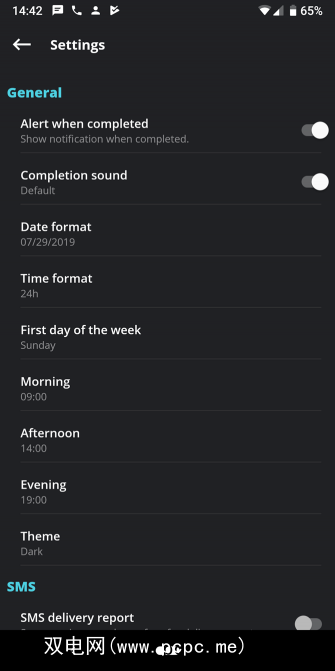 点击右上方的菜单按钮,然后选择设置进行调整应用程序的工作方式。在这里,您可以设置应用在一般时段(例如早晨和下午)使用的时间,更改警报选项,请求发送报告等。