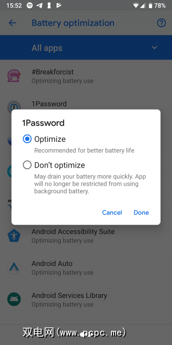 下一步,点击电池优化您会看到一个新列表。最后,点击屏幕顶部的未优化文本,并将其更改为所有应用。