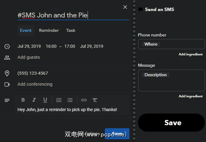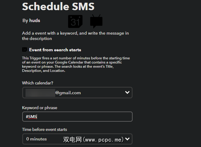 首先在手机上安装IFTTT Android应用程序(如果尚未安装) 。然后,您可以使用此IFTTT小程序,以便使用IFTTT安排SMS消息。这取决于Google日历事件;当发生带有特定参数的新日历事件时,它将发送一条短信到您选择的号码。