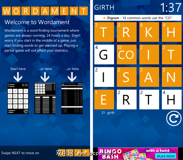 Wordament大约一年前才出现在iOS上,并且一直是Windows 8商店中最受欢迎的游戏之一。游戏涉及从字母方块中找出单词,并与所有其他Wordament用户竞争。游戏每两分钟发生一次,所有玩家都玩同一组字母。您可以使用Xbox Live gamertag或Facebook帐户登录,如果您连接到Xbox Live,则可以赚取多达50个Gamerpoint。