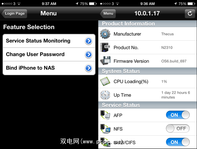 Thecus仪表板:使用移动仪表板需要在NAS上安装其他应用程序(可通过 NAS应用程序图标访问,而不是应用程序安装图标,显然是访问)。连接后,该应用程序可让您查看当前资源使用情况,禁用服务以及更改密码。是的,就是这样。哦,还有一个“将iPhone绑定到NAS"的好奇心–您的猜测和我的一样好。如果您有一套要管理的企业级NAS设备,则该应用程序可能更有用,但对家庭用户而言却毫无用处。