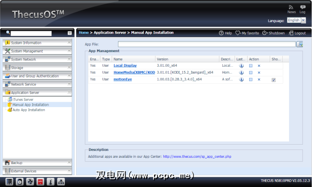 例如,在2016年,您只是希望在某个地方找到某种应用程序商店。不幸的是,在OS 5下,您需要导航到Thecus网站,按型号缩小应用列表(尚不清楚是否需要64位或32位ATOM或其他CPU版本)。即使这样,仍会显示许多重复项,但不清楚原因。记录下来,每个版本都是不同的,但是直到您单击该项目,版本信息才会显示。您可能需要最新版本;我下载了本地显示和Kodi的15.2版本来测试媒体中心功能。