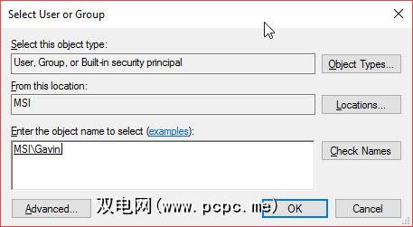 在输入要选择的对象名称下输入管理员帐户的名称,然后按检查名称。 >。它应返回您的计算机名和管理员帐户名,如下图所示。然后按确定。