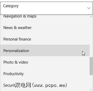 加载Windows应用商店后,选择热门应用。然后从类别下拉菜单中选择个性化。