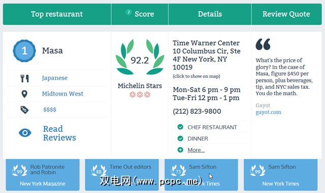 找到感兴趣的餐厅时,您可以找到餐厅的营业时间,位置和电话号码,并阅读评论家的评论。如果餐厅有米其林星,您也会在这里看到它。无法从此处查看餐厅的网站或菜单,但是通过Google进行快速搜索可以轻松将您带到那里。