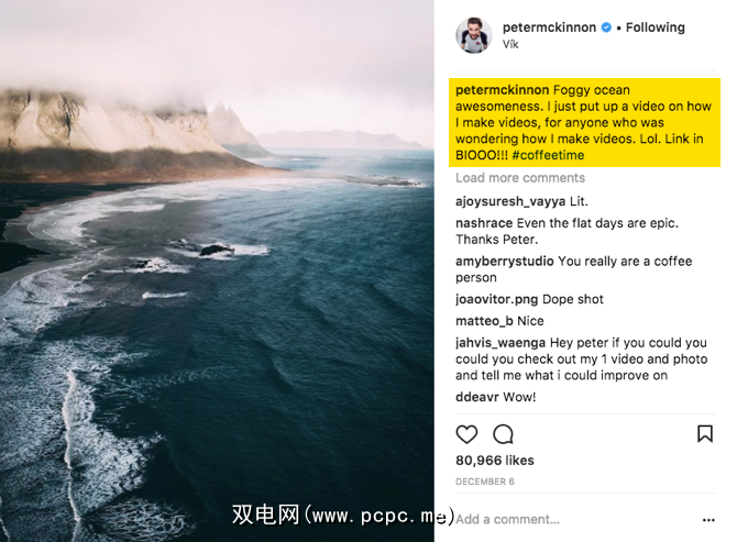 带字幕的帖子比没有字幕的帖子吸引更多的参与并不是什么秘密。只需像Peter McKinnon一样添加一些上下文即可。您还可以提出问题,分享故事或提出号召性用语。但是无论您做什么,都不要将标题留空。