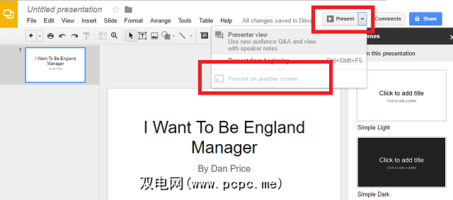 这是因为,通过导航至Google幻灯片,单击右上角的当前,然后选择在其他屏幕上显示从下拉菜单中,Allardyce可以轻松地将其演示文稿广播到建筑物中的任何屏幕上。而且,您可以做完全相同的事情来避免遭受与阿拉迪斯相同的命运。