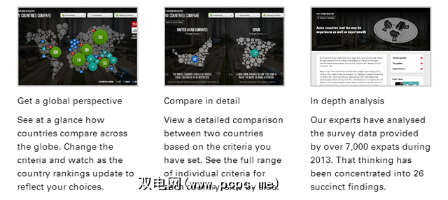 Expat Explorer可能是前往国外研究地点的最佳在线资源。这是一项针对世界各地成千上万移民的全球独立调查,将所有数据合并到一个交互式网站中。一目了然,您可以看到各个国家/地区在外籍偏好方面的排名如何。
