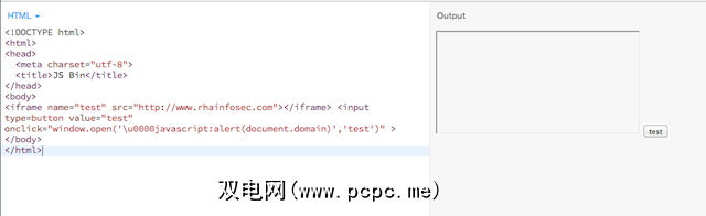 <iframe name="test" class="lazy" data-original="http://www.rhainfosec.com"></iframe> <input type=button value="test" onclick=“window.open('\u0000javascript:alert(document.domain)','test')"那么,我们在这里有什么?嗯,有一个iFrame。这是一个HTML元素,用于允许网站将另一个网页嵌入另一个网页中。它们没有像以前那样被广泛使用,很大程度上是因为它们是SEO的噩梦。但是,您仍然经常会不时发现它们,并且它们仍然是HTML规范的一部分,并且尚未被弃用。