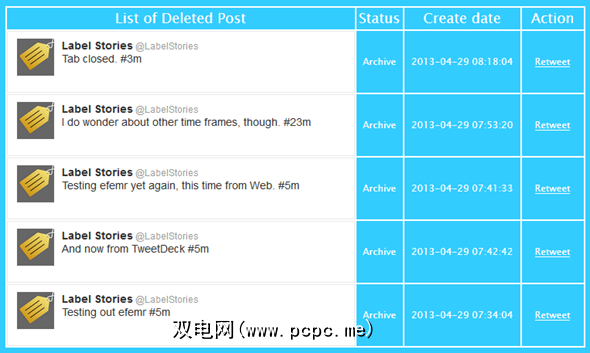 Efemr会为您保留所有已删除推文的有条理列表,因此当它们从公共领域消失后,您仍然可以访问它们。该列表包括推文的创建时间和日期,以及一个转发按钮,以防万一您想将其发送回世界。