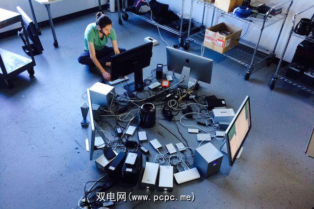 是时候有点怪了。 MacWorld的人们采用了新的Mac Pro,该Mac Pro具有六个Thunderbolt端口,四个USB 3.0端口,一个HDMI端口和两个以太网端口,并将实验推向了极限。他们的设置如下所示: