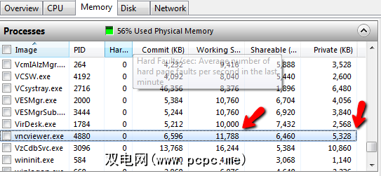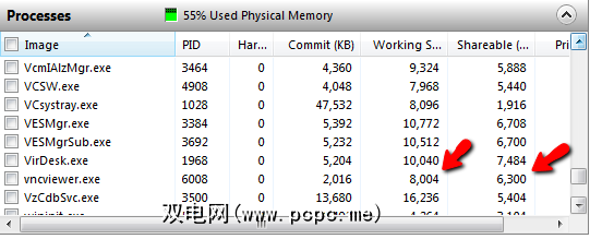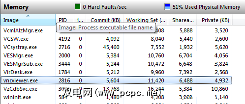 运行UltraVNC,我打开了资源监视器,然后直接进入存储区。如您所见,以图像名称“ vncviewer.exe"运行的UVNC占用了不到5,000K的私有内存空间,总共为该应用程序预留了超过11,000的空间。