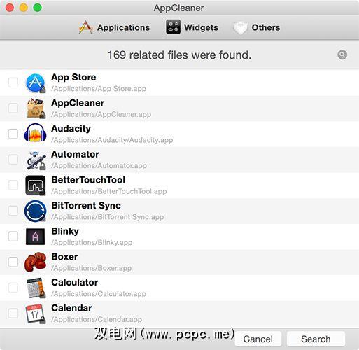 另一个可以帮助您快速恢复磁盘空间的应用程序是AppCleaner(上图),它是一个卸载助手,可让您彻底在网络中卸载应用程序。只需检查要删除的应用程序,单击搜索,所有关联的文件和文件夹将显示。然后您可以点击 Delete 删除所有内容。
