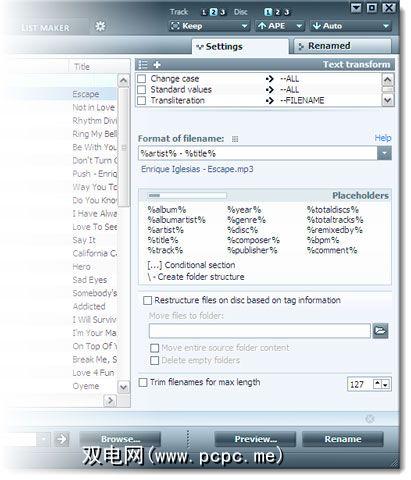 您可以输入一种重命名格式,所有选择的文件将根据新的文件名格式命名。您可以结合使用固定文字字符和占位符。例如– %title%是一个占位符,该轨道的标题取自特定文件。您可以固定所需文件名的长度。