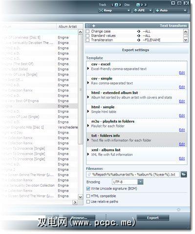 您可以使用上述三个过程以任何顺序。但这是所有内容都经过整齐标记后最终应该使用的选项卡。您可以选择歌曲并将其导出为多种格式的播放列表。 TagScanner为您提供了该工作的多个模板。您不必为编码太费心,因为默认编码可以解决问题。考虑周到的设置是在导出的文件和源文件之间使用绝对或相对路径的选项。通过相对路径,您可以将播放列表和源文件夹一起传输。