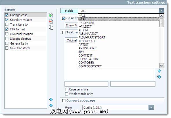您可以更改文件名的大小写,转换非英文字符,使用FTP服务支持的格式,以便文件传输不会被阻止,清除不需要的Discogs数据等。“文本转换"可与您当前位于的选项卡中的其他字段一起使用。