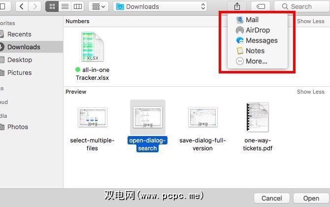在弹出菜单的“打开"对话框中单击 Share 工具栏按钮。应用程序,您将看到标准的macOS共享菜单。与在Safari,Notes和Preview等各种常见应用中看到的相同。