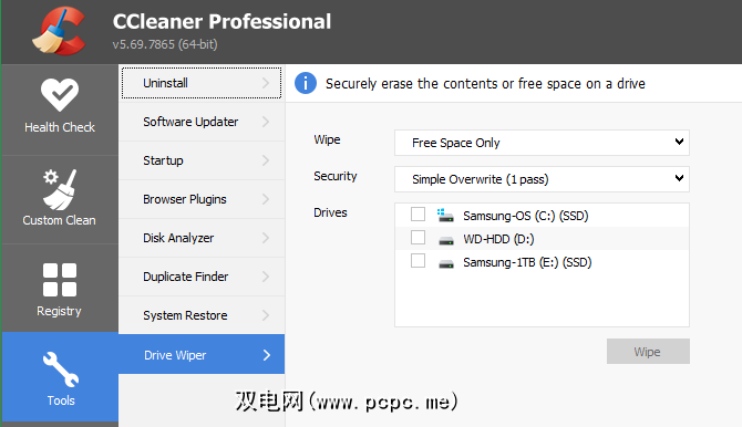 系统还原只是让您擦除系统还原点。虽然这对于回收空间很有用,但最好让Windows处理。最后,驱动器刮水器为您提供了完全擦除连接到PC的任何驱动器上所有内容的选项。