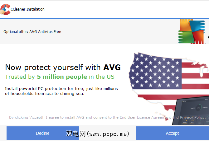首先,当我们安装CCleaner的免费版本时,它提示我们也安装AVG Antivirus。虽然不是恶意程序,但像这样在您身上强加软件是不明智的。尤其是奇怪的是,由于近年来许多免费软件已停止提供捆绑的垃圾软件。