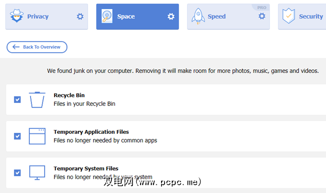 < strong>隐私权会从PC上的各种浏览器清除cookie,浏览器历史记录和临时Internet文件。 Space 清除回收站,临时应用文件和Windows系统临时文件。