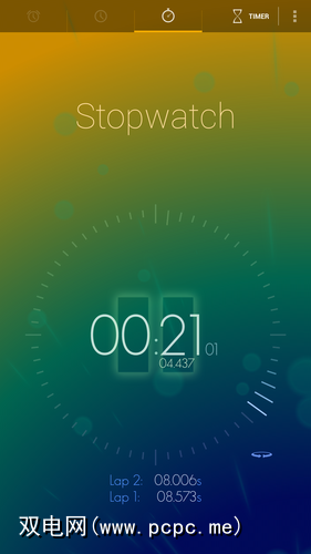 秒表使用屏幕的主区域来右下角有一个小圈计时器来启动和暂停: