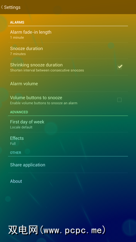 您可以选择警报的渐入长度和再响持续时间,以及让再响持续时间逐渐缩小(再响越多,两次响闹之间的时间越短)。这是Gentle Alarm的另一项功能,但是Gentle Alarm允许您基于配置文件指定此功能,而Timely对所有警报使用全局设置。您还可以设置一周的第一天,以及控制应用程序使用的视觉效果。